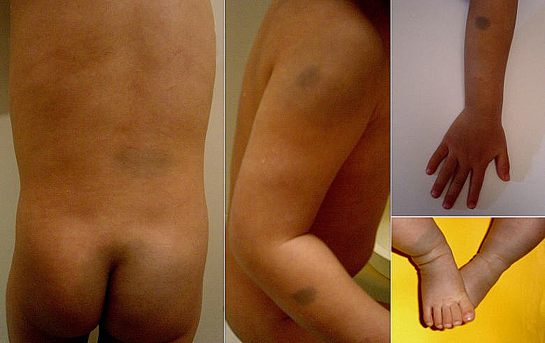 In these pictures all deep blue spots are ectopic and may become persistent Mongolian spots which remain until adulthood. - Ectopic Mongolian spots,aberrant Mongolian spots