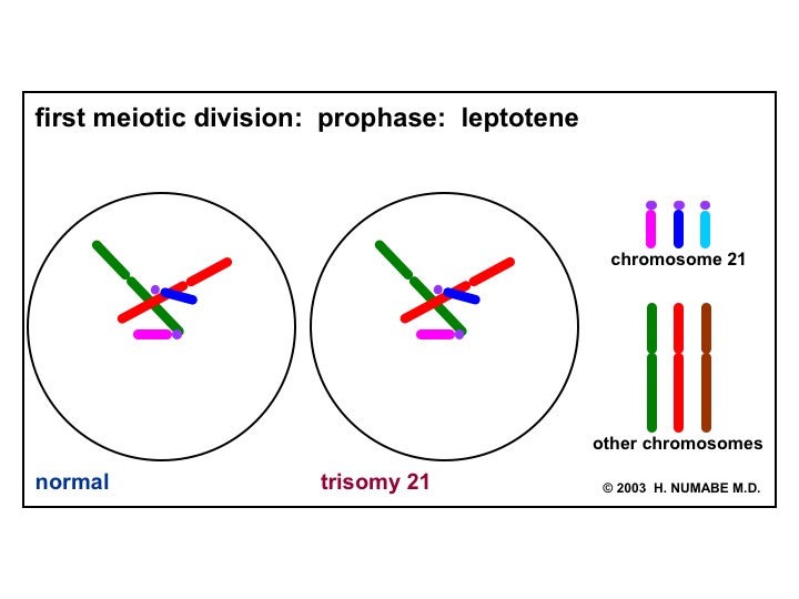 また,ここでは卵子形成における不分離を示しましたが,同様の不分離は精子形成時にも起こり得ます.また,転座型のDown症候群の発生機序はここに示したものとは全く異なります(転座型Down症候群動画).