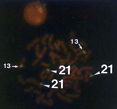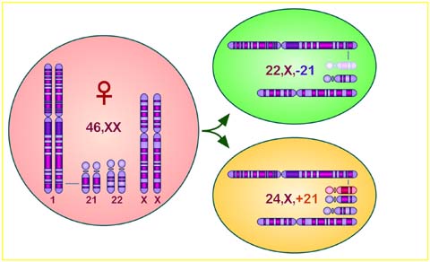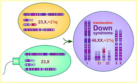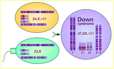 ここに示した減数分裂~受精のアニメーションは,トリソミー型のDown症候群の発生を模式的に示したもので,第1成熟分裂時に染色体が1本ずつうまく分かれられない不分離を示していますが,第2成熟分裂時にも同様の不分離が起こり得ます.このアニメーションはあくまで概念的なもので,受精のタイミングなどは,実際の時期とは若干異なります.